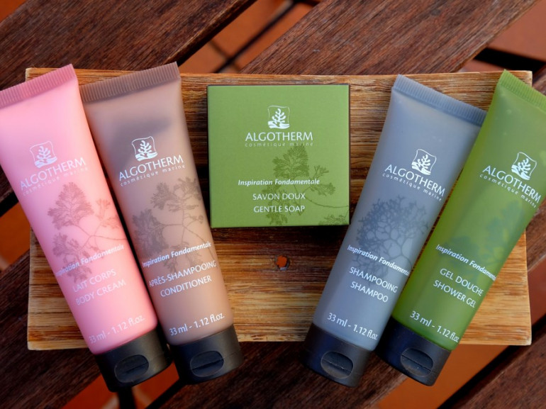 Baño de azulejos con ducha, secador de pelo, radiador toallero y amenities de Algotherm
